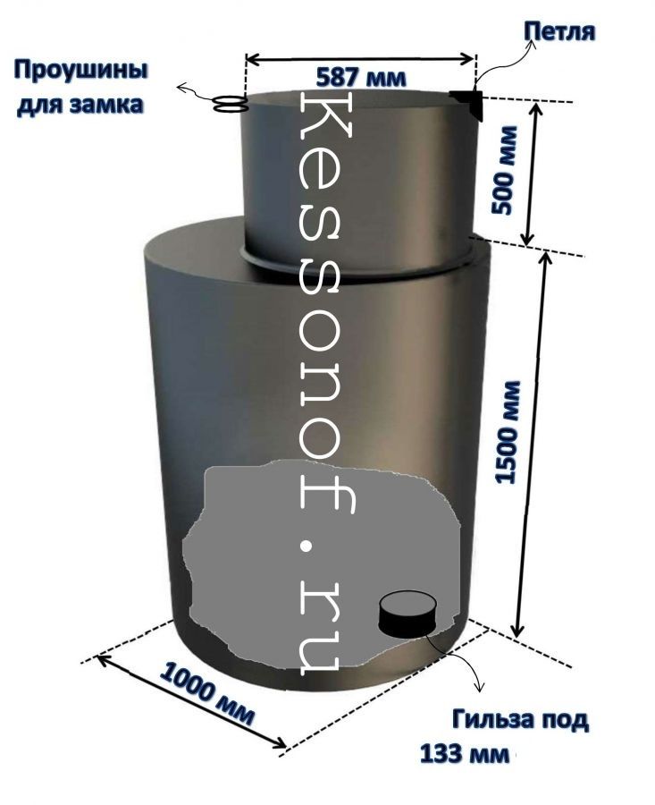 Кессон круглый с толщиной 3мм, общая высота 2000мм,высота рабочей камеры 1500мм, диаметр рабочей камеры 1000мм, высота верхней горловины 500мм, диаметр верхней горловины 600 мм